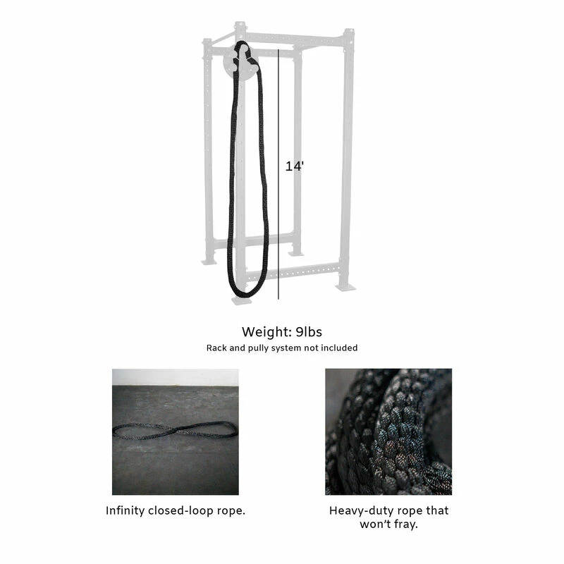 The Titan Fitness® 14-Foot Infinity Rope (replacement rope) was designed to be used with our Rack Mounted Rope Pulley attachment. Durably built with grip-friendly Nylon, this never-ending infinity rope will be able to handle whatever you throw its way.