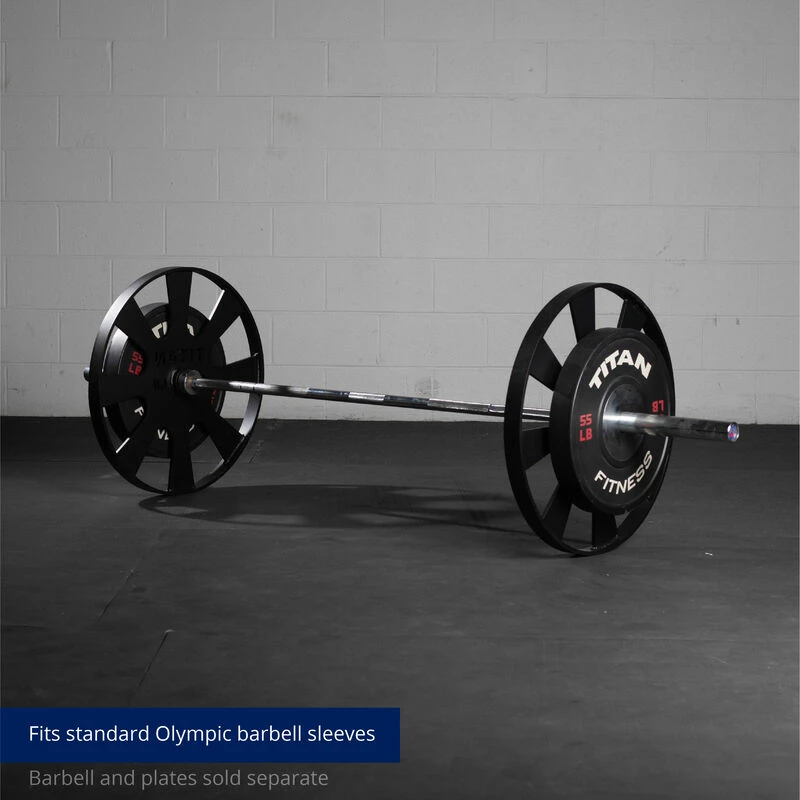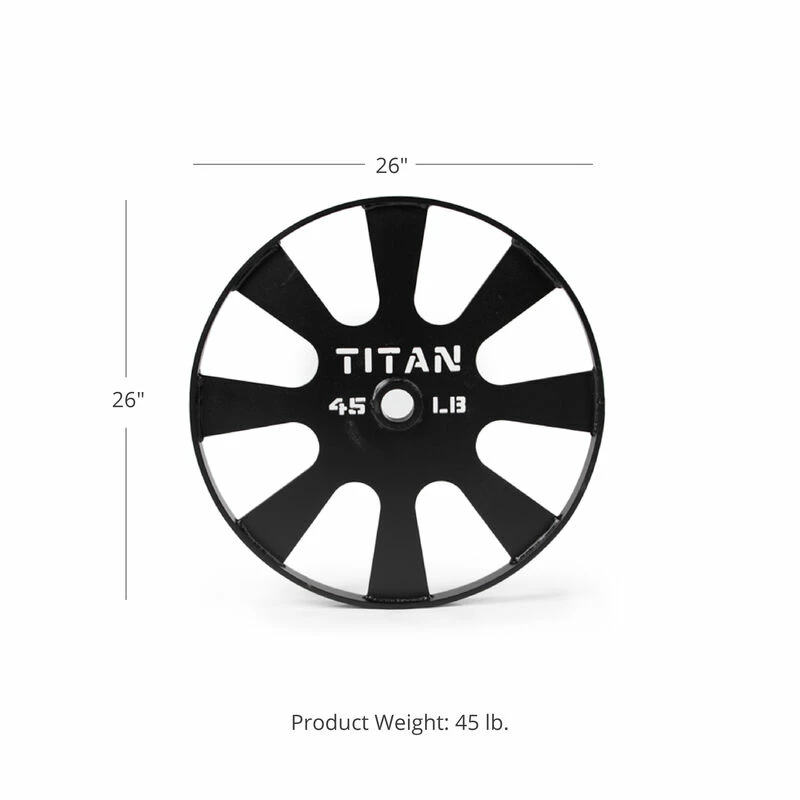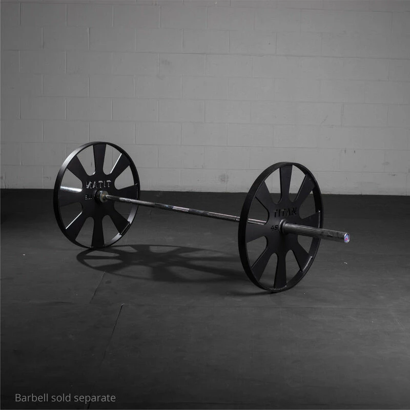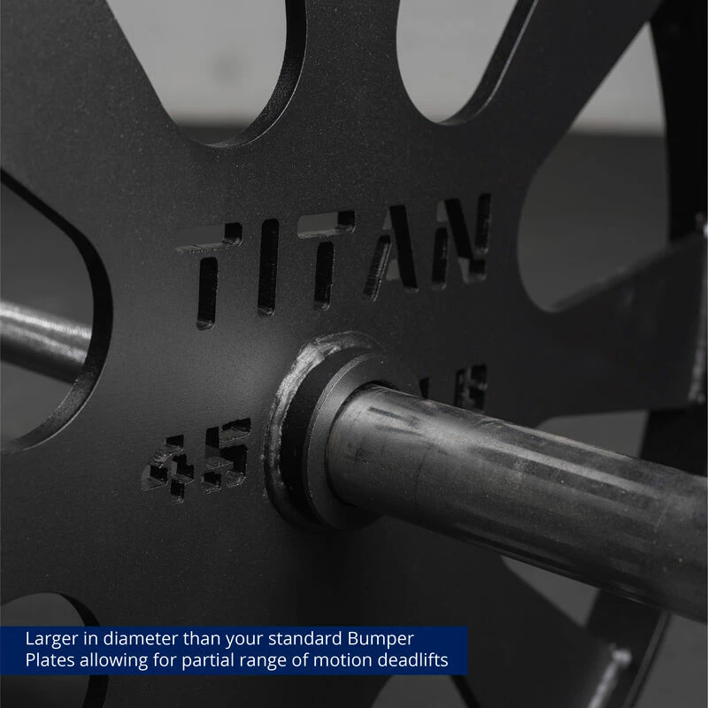 The Wagon Wheel Pulling Blocks are offered in a pair of 45-pound weights, designed for athletes from beginner to serious Deadlifter. Each plate is crafted from 0.375-inch-thick laser-cut steel, features a 51 mm collar opening and a 2-inch lip that helps carry and prevent wear from drops. These 26-inch Wagon Wheels eliminate the need for typical Deadlift Pulling Blocks. With their increased height verse the standard 17.7-inch weight plate, loading and unloading your barbell becomes a breeze without needing a jack or wedge. At this elevated height, the barbell is set up for partial range-of-motion deadlifts perfect for taller athletes or powerlifters suffering from knee and lower back issues.