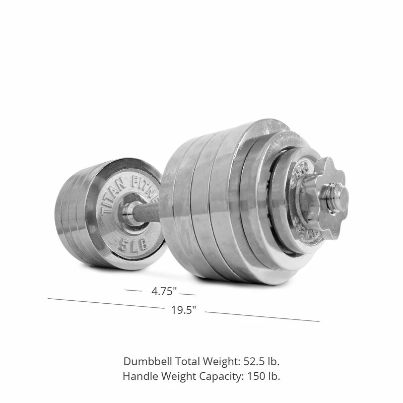 The Chrome Coated Adjustable Dumbbells offer multiple weight options from 5-pounds to 52.5-pounds. The set includes two 19.5-inch Adjustable Thread Dumbbell Handles with Lock Collars that features a 25mm diameter center with knurled competition texture for a comfortable and firm grip that holds up to use and weather. The durable weight plates come in 1.25, 2.5, 5-pound increments that feature the weight and TITAN branding. The weight plates allow you to dial in the exact weight you need for training. With these dumbbells, you can do a range of exercises that target your biceps and triceps, abs, delts, traps, back muscles, etc.