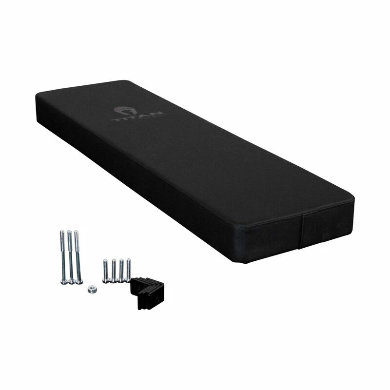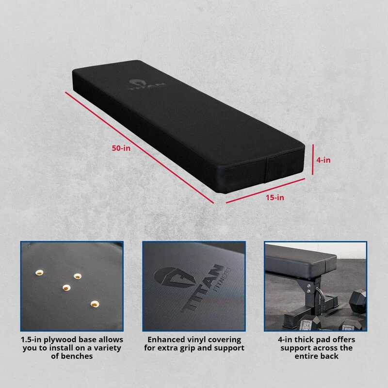 The Hefty Pad is the perfect addition to your Competition Flat Bench. With our enhanced vinyl covering made for unparalleled support, feel, and extra grip. The added 15-inches of width and 4-inches of thickness give your back and shoulders additional support while performing bench presses. Added benefits of the Hefty Pad include the promotion of scapular movement, which eliminates AC tears, no longer needing to deal with shoulder hangover, optimizes back and upper body positioning, and increases mechanic leverages. The Hefty pad is designed to bolt onto any Titan Fitness Flat bench. It has a 1.5-in plywood base that enables it to be mounted to a variety of benches as well.