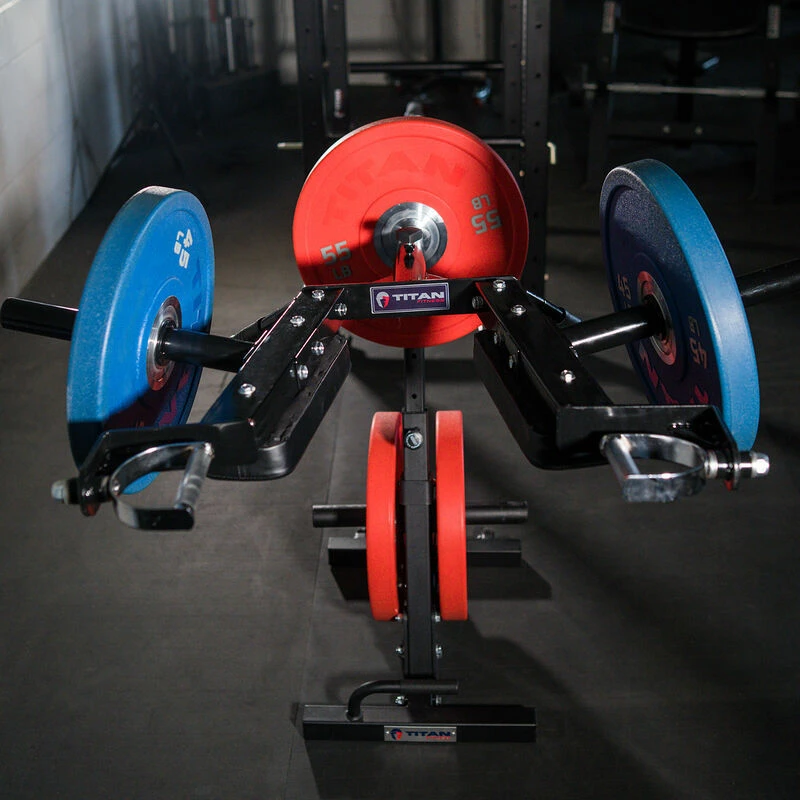 NOTE: Titan recommends resting the product on the ground to load plates before pairing with the landmine stand. (Landmine stand sold separately.) This will prevent spinning during the plate-loading process.