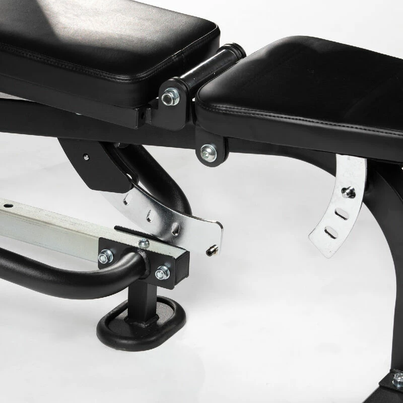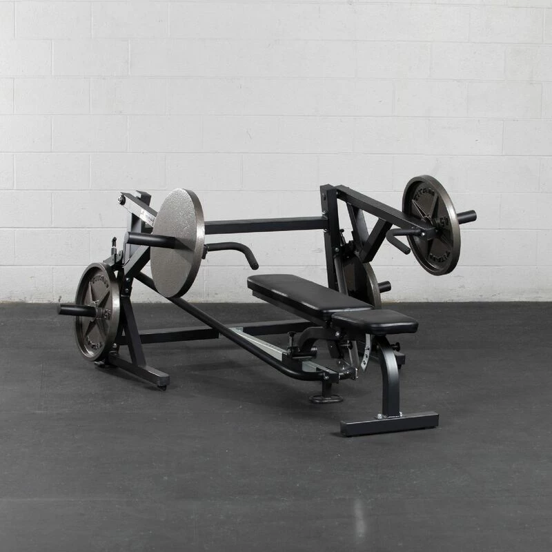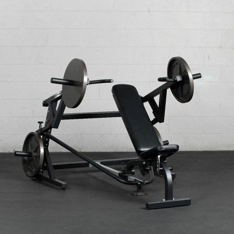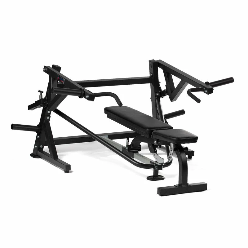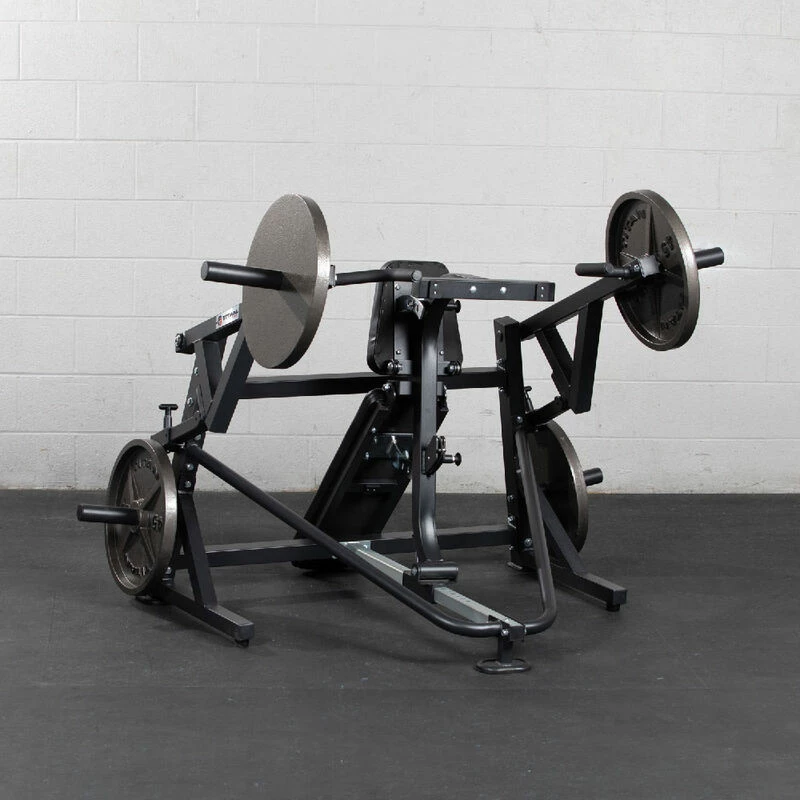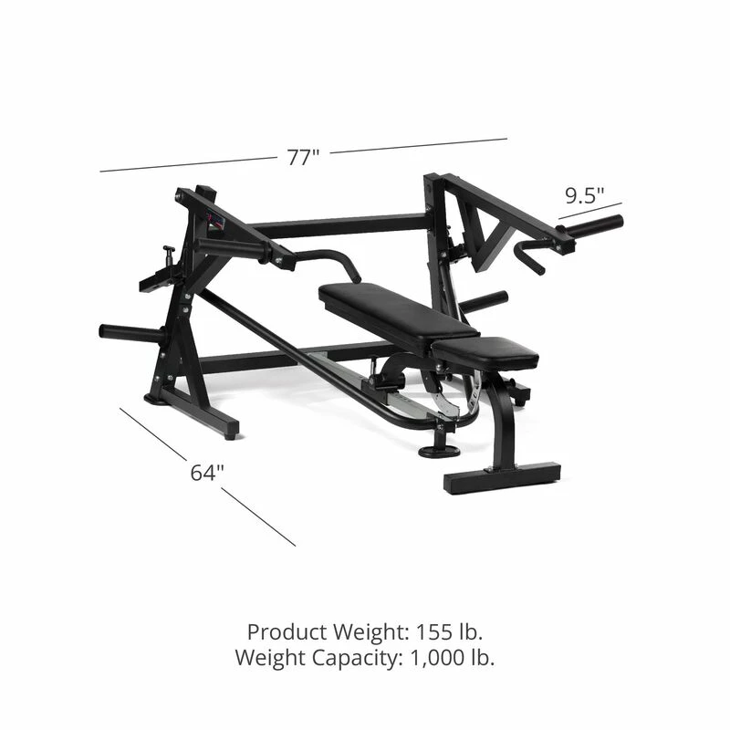 The Plate Loaded Chest Press Machine is constructed for home and garage gym athletes that may need a safety catch while lifting alone. Built out as a fully functional upper body multi-press that allows the user to feel the same range of motion as free weights. Each arm is independent of the other, allowing for various weight levels on each arm or stack the weights for a balanced development of your upper body. The specialty machine includes an adjustable FID bench with several incline and decline positions. Lay the bench flat to develop pectoral or chest muscles. Adjust the seat at an incline to put less strain on your rotator cuff and activate your deltoids. Or position the bench at a decline and rep through an abdominal routine.