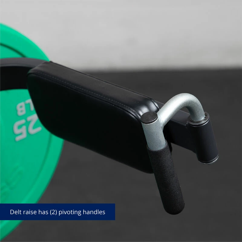 The Deltoid and Shoulder Press Machine is designed to isolate deltoid muscles and build strong, defined upper back and shoulder muscles. Featuring independent arm movements, the shoulder press features (2) sets of hand grips, and a spring-loaded raised lockout. While used as a deltoid machine the features include (2) pivoting handles with 10-inch forearm pads to focus on deltoid development. This unique machine features shoulder press sealed bearings, four plate-loaded weight sleeves, and an adjustable seat to fit athletes of all sizes.