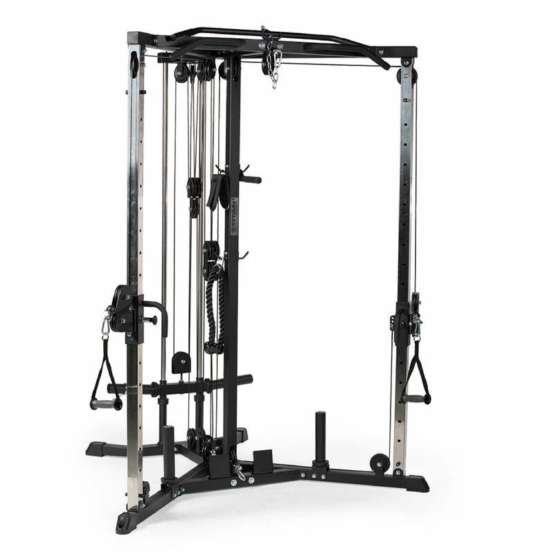 The comprehensive workout offered by the Plate Loaded Functional Trainer will add new depth to your home gym experience. Bulk up your fitness routine with pulldown and low-row training exercises that build strength for your lower / middle back muscles and forearms. With up to 600 LB weight plate capacity, you can efficiently perform pulldowns, flies, squats, lunges, twists, and more. The specialty machine comes with dual stirrup handles, a lat bar, and a low row handle so you can quickly move from one exercise to the next to maximize your workout. Use the lower cables to add horizontal force to your regular activities such as lunges, squats, and step-ups – increasing your gains and adding new dynamics to your home gym. The Functional Trainer is built for long-lasting use, ensuring its durable steel construction will stay strong through even the most intensive exercises. The black and silver design looks sleek in every setting and will compliment your home or garage gym. This machine is the ultimate answer to your workout plateau and will rock your fitness routine to the next level.