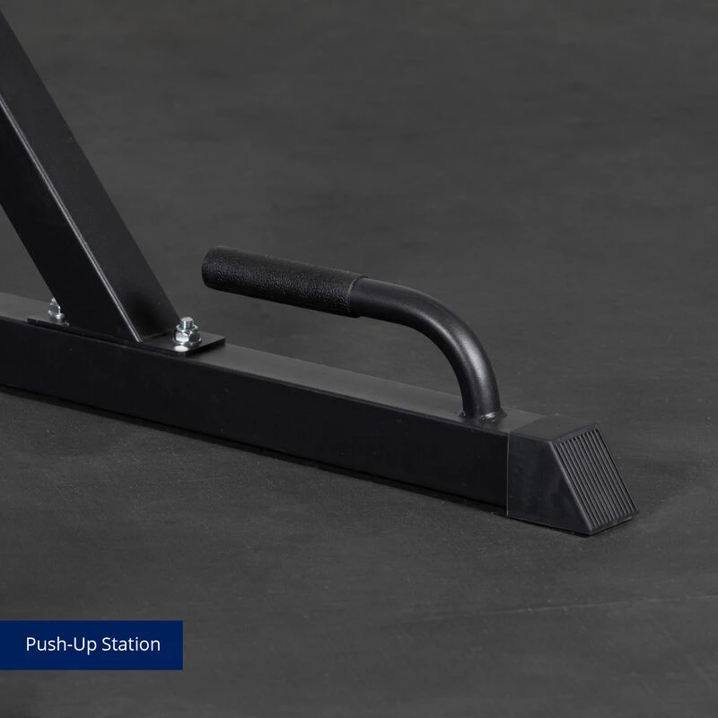 PUSH-UP STATION: The built-in elevated push-up station features molded handgrips that allow you to target your chest and shoulders. NOTE: Keeping your arms close to your sides targets your triceps or position yourself in a broader pose to isolate your chest.