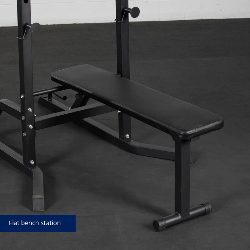 FLAT BENCH STATION: The built-in foldable flat gym weight bench features a comfortable leather exterior that allows you to perform bench presses, pullovers, rows, and other flat bench routines. Additionally, the station comes with two J hook pegs and three height choices.