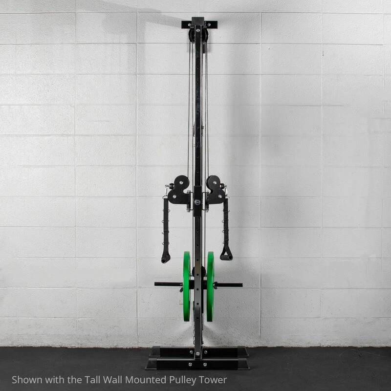 The versatile workout offered by the Short Wall Mounted Pulley Tower will add new depth to your home gym experience. Bulk up your fitness routine with pulldown and low-row training exercises that build strength for your lower / middle back muscles and forearms. With up to 350 LB weight plate capacity, you can efficiently perform pulldowns, squats, lunges, rows, and more. This pulley tower is plate-loaded, featuring 1″ weight posts, spring clips to match, and dual stirrup handles for developing triceps and back muscles in pulling and rowing exercises. The cable tower is built for long-lasting use, ensuring its durable steel construction will stay strong through even the most intensive workouts. The black and silver design looks sleek in every setting and will compliment your home or garage gym.