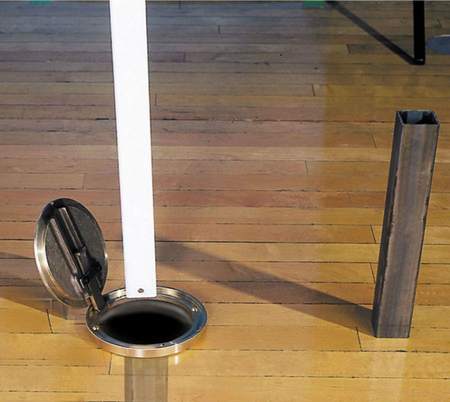 Floor sleeves with cover plates allow easy removal of posts when not in use.