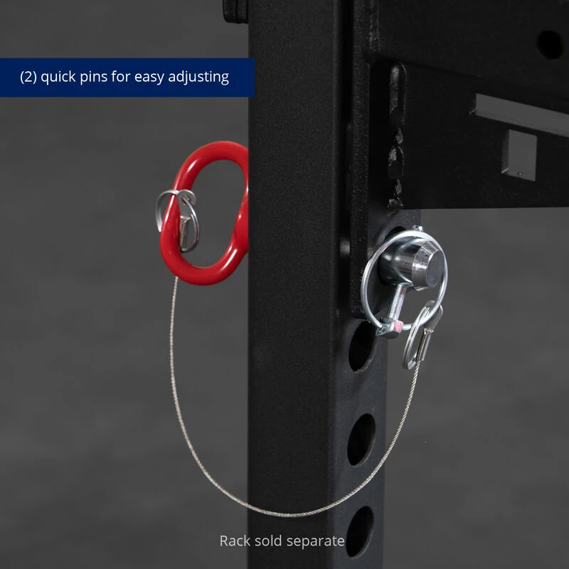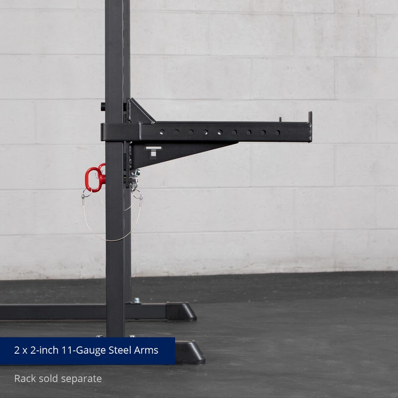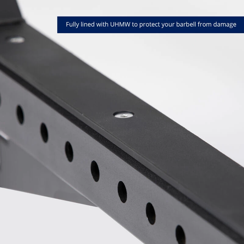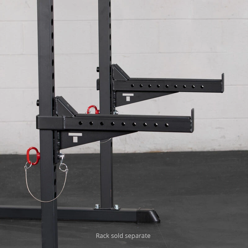 The T-2 Series Spotter Arms by Titan Fitness® are designed specifically for the T-2 Series Power Rack to provide extra security when lifting weights alone. Constructed from heavy-duty 11-gauge steel, these Spotter Arms will hold a weight capacity of 800-pounds. Featuring fully lined UHMW plastic liners and a durable powder-coated finish to protect your safety catches and barbell from damage. Additionally, the arms are easy to adjust up and down your T-2 Series Rack with quick pin adaptors. These durable Spotter Arms are an absolute must-have for anyone who prefers to do hard training alone.