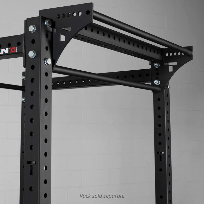 The Dual Pull-Up Stabilizer Bar by Titan Fitness® mounts on the top front or back of your T-3 or X-3 Series Power Racks. Constructed from heavy-duty, 3 x 3-inch 11-gauge steel with 2-inch hole spacing spanning the length of the 42-inch stabilizer bar. Featuring laser-cut TITAN “T” logos engraved into the gusset plates welded to the stabilizer bar. Additionally, the crossmember features two levels of 32 mm smooth staggered height bars constructed to improve your grip, back muscles, arms, shoulders, and more. Improve your workouts with the Dual Pull-Up Stabilizer Bar.