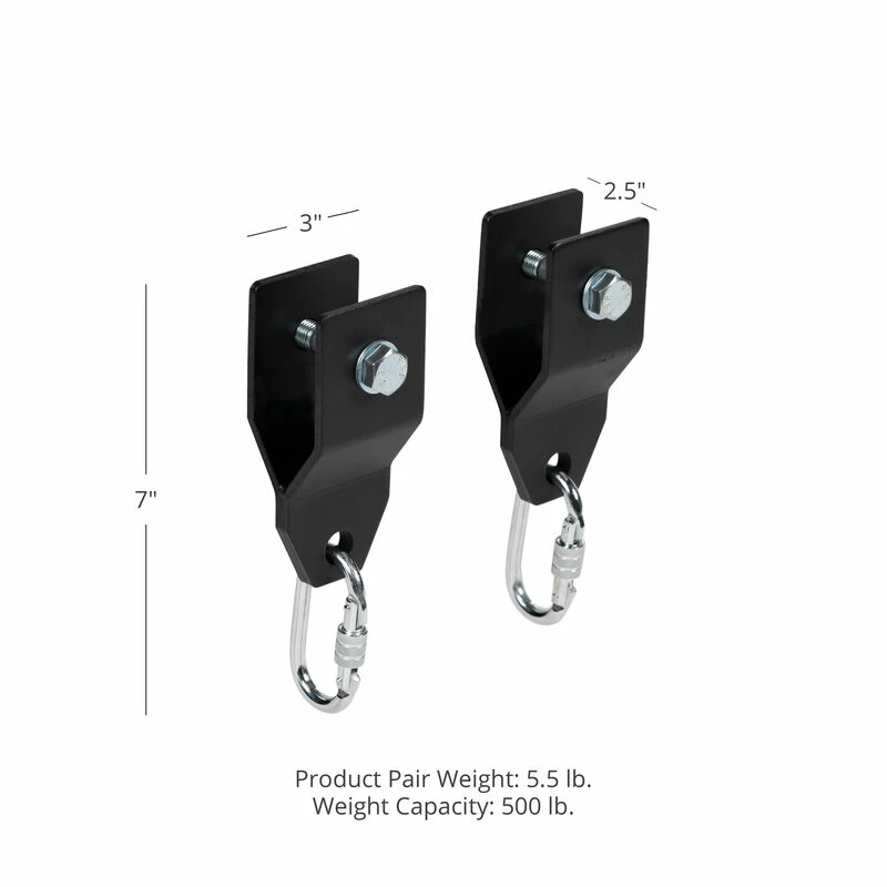 These Shackles are the perfect way to add accessories to your T-3 Series Power Rack. Constructed from laser-cut, precision-bent steel that will hold a weight capacity of 500-pounds. This bolt-on set attaches to the upper 2 x 3-inch crossmember of your power rack with the included hardware. The shackles, paired with carabiners, allow you to hook into a variety of grip strength accessories including, rings, pull-up blocks, grip cylinders, spheres, and more. Additionally, you can mount the shackles to the front of your upright to add more variety to workouts or utilize them as a space saver to hang accessories.