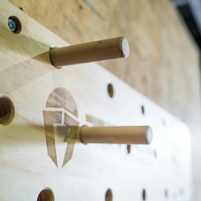 The Wall-Mounted Peg Board is the perfect challenge for athletes looking to improve their upper body strength in a new and dynamic way. This is a popular tool for strength training commonly used in training for rock climbing, gymnastics, MMA, and more. Titan’s design includes 17 staggered holes along the 4-foot birch wood board, with 4-mounting holes (mounting hardware included) spaced 30-inches apart and 9.5-inches across. The board’s thickness is 1.5-inches and includes 2-easy-grip hardwood dowel rods measuring at 6.5-inches in length and a 1.175-in diameter.